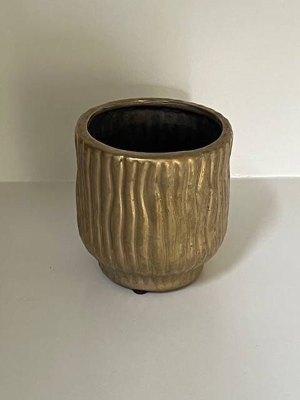 Creeer een luxueze sfeer in je interieur met de Mica Decorations bloempot. Deze elegante keramieke bloempot heet een prachtige gouden afwerking en is voorzien van een subtiel lijnenpatroon. Verkrijgbaar in twee maten,