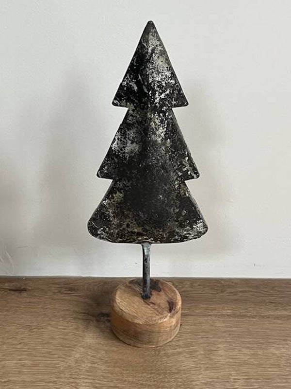 Breng een vleugje rustieke charme in huis met deze unieke metalen kerstboom. Vervaardigd uit verweerd metaal staand op een stevige houten voet. De gelaagde abstracte boomvorm geeft het een moderne, maar tegelijkertijd een tijdloze uitstraling die zowel in een landelijk als industrieel interieur past. De boom is leverbaar in twee maten.
