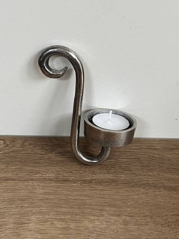 De robuuste metalen haak geeft een stoere, industriele uitstraling, terwijl het heldere glas het zachte licht verspreidt.
