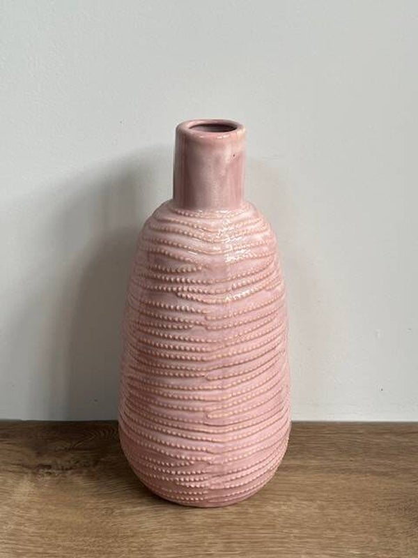 Deze vazen zijn met de hand vervaardigd, wat elk exemplaareen uniek en persoonlijk karakter geeft. De zacht, roze tint en de opvallende textuur maken het een stijlvolle toevoeging aan elk interieur. Verkrijgbaar in twee maten.